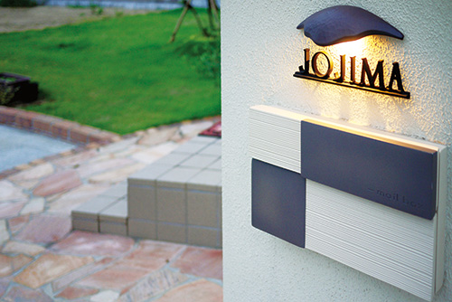 風情ある照明効果を演出するため、一般的な表札前面を照らす表札灯よりも光源位置を壁際に設計しています。表札の裏側に光源をもってくることによって、浮き上がるようなイメージに照らすことができます。 目障りな影も出にくい設計になっています。